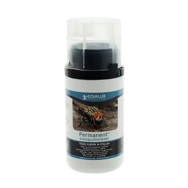 De permanent stalspuit is een middel ter bestrijding van vliegen in verblijfplaatsen voor vee. Dit middel mag worden toegepast in aanwezigheid van dieren. Inhoud: 60ml.